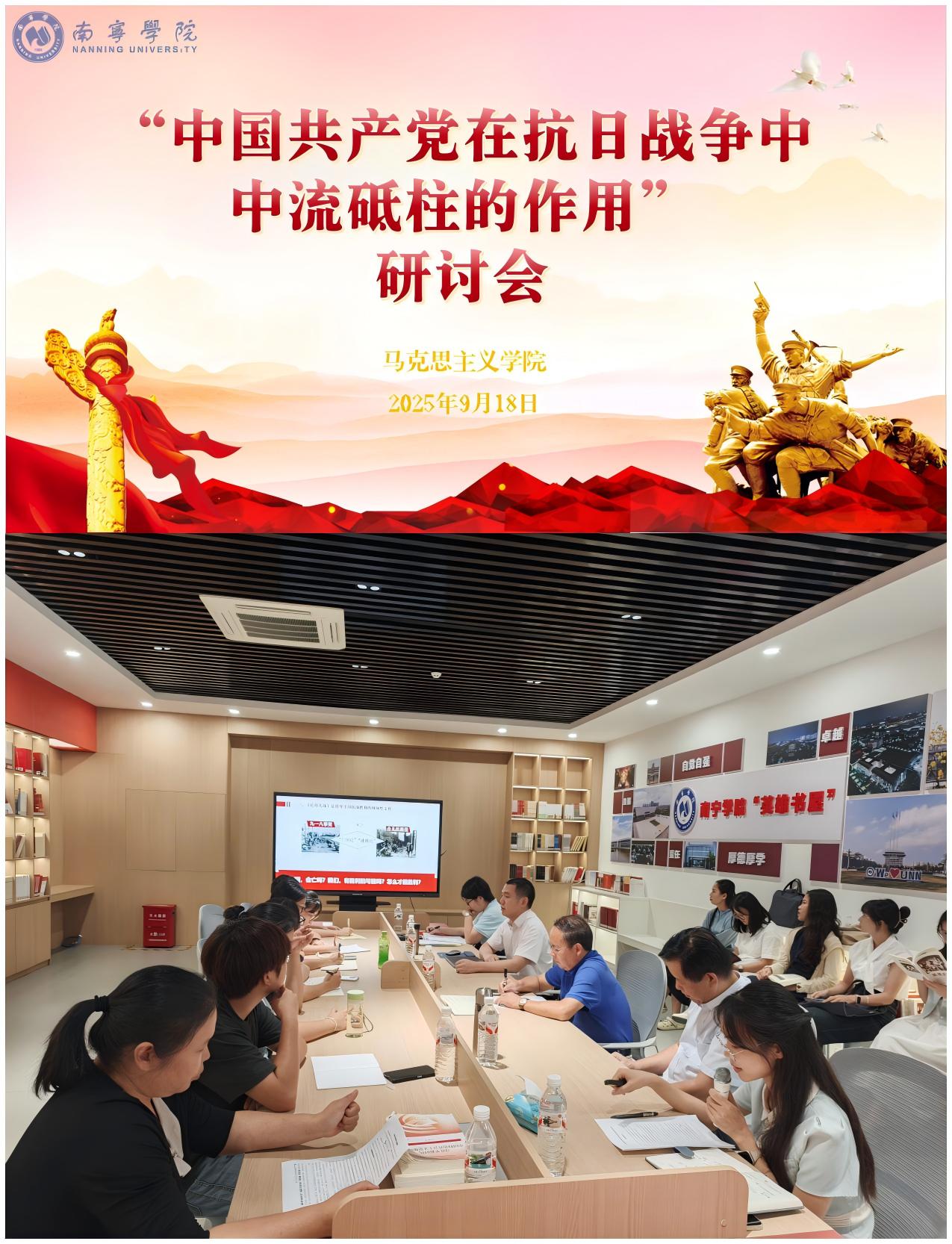“九一八”事变的炮声拉开了日本帝国主义侵华战争的序幕,点燃了中华民族十四年抗日战争的烽火。为深入挖掘历史内涵、传承红色基因、厚植爱国情怀与历史责任感,并进一步深化对中国共产党在抗日战争中中流砥柱作用的理解9月18日下午,马克思主义学院“社会实践(传承英雄正气新体验)”教学团队联合南宁学院英雄精神传承体验研究中心,在“英雄精神传承体验馆”英雄书屋举办“中国共产党在抗日战争中中流砥柱的作用”研讨会。国家级一流本科课程“社会实践(传承英雄正气新体验)”负责人陈雄章教授、马克思主义学院教师及学生代表等40余人参会,会议由马克思主义学院副院长张雪娇主持。
