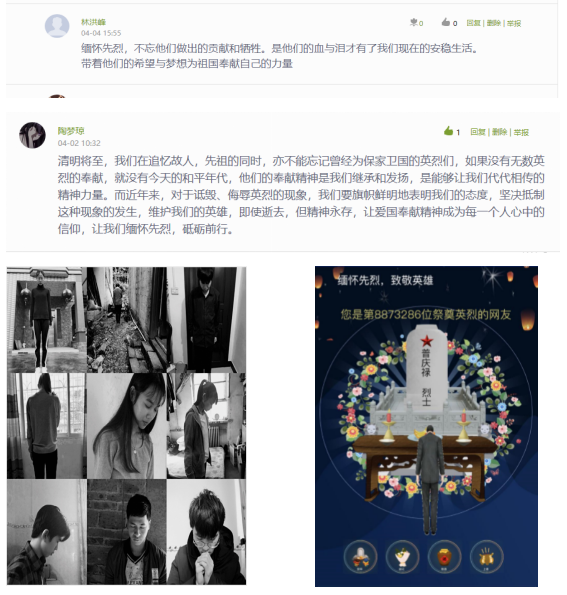 本次系列活动一:观看新华社微电影《红色气质》。该微电影是献给党95岁的生日礼物,讲述的是中国共产党95年的光辉历程。在观看微电影过程中,看着无数共产党员先烈们凭着对共产主义的信仰和执着,为了党和人民,为了国家民族,抛头颅洒热血,矢志不渝奋斗终身的付出,同学们深受感动,纷纷在网上发表感言,讨论新时代大学生该如何传承红色气质,为中华民族伟大复兴贡献自己的力量。系列活动二:开展线上祭奠英烈。同学们在中华英烈网参与祭扫、献花仪式活动中了解英烈、缅怀先烈、致敬英雄。系列活动三:师生共同参加4月4日全国性哀悼活动。在哀悼中,深切缅怀每一位牺牲在抗击新冠肺炎疫情前线的烈士。系列活动四:开展线上研讨。教师根据授课内容,组织学生进行线上思考和讨论,如“广西在抗日、抗美援朝以及对越自卫反击战中牺牲的烈士有哪些”,“青年人应如何传承英烈精神”, “面对网上流传的‘黄继光堵枪眼是假的’,‘董存瑞炸碉堡不是真的’,‘邱少云这样做不可能’,‘揭秘狼牙山五壮士’,‘雷锋事迹是伪造的’等言论,你怎么看”等问题,学生们积极参与并予以热烈回应。