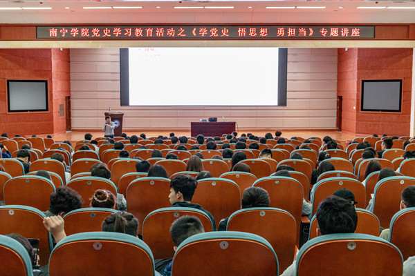 五四前夕,为庆祝中国共产党百年华诞和纪念五四运动102周年,扎实开展党史学习教育,从党的百年奋斗史中汲取智慧和力量,弘扬五四主旋律,教育引导广大青年师生学党史、悟思想、勇担当,坚定理想信念,鼓足迈进新征程、奋进新时代的精气神,4月28日晚,南宁学院党委副书记、纪委书记覃存民在图书馆报告厅给全校师生党员和学生干部代表做了题为“学党史 悟思想 勇担当”的专题讲座。讲座由南宁学院马克思主义学院院长王静静主持,我校500多名师生党员和学生干部代表参加学习。