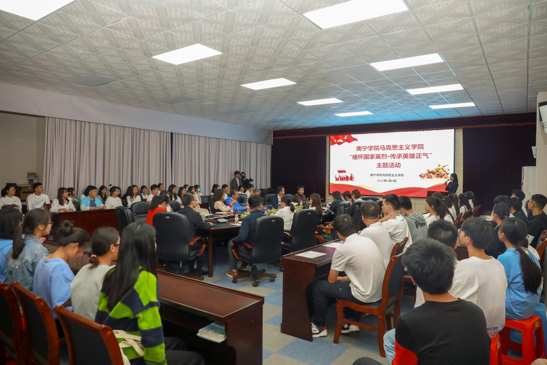 为缅怀国家英雄烈士,引导广大师生铭记中国共产党百年奋斗光辉历程,重温红色记忆、厚植英雄情怀、传承英雄正气,涵养扎实学风,充分激发青年学生的时代责任感和使命感、讲好传承英雄精神这堂生动的“大思政课”。4月4日晚,学校副校长、自治区一流课程《社会实践(传承英雄正气新体验)》课程负责人陈雄章教授在大学生活动中心302会议室作“厚植英雄情怀 涵养扎实学风——以桂南会战阵亡将士纪念遗址调研为例”为主题的缅怀国家英烈沙龙活动。《社会实践(传承英雄正气新体验)》课程团队师生代表共100余人参加了本次活动,活动由马克思主义学院副院长董艳副教授主持。