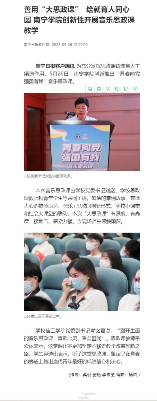 南宁日报报道链接:善用“大思政课” 绘就育人同心圆 南宁学院创新性开展音乐思政课教学https://h5.newaircloud.com/detailArticle/19184530_52327_nnrb.html?source=1