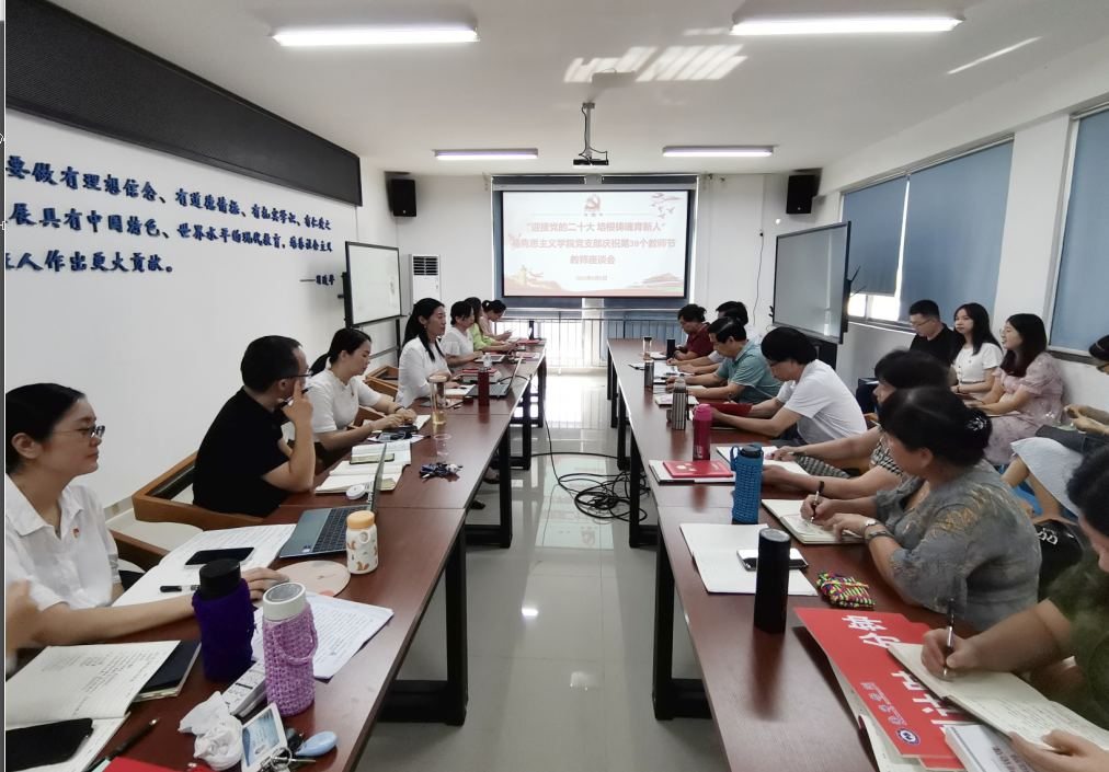为迎接党的二十大胜利召开,强化政治引领,提振精神风貌,在教师节来临之际,马克思主义学院党支部于9月6日下午在行政楼125召开以“迎接党的二十大 培根铸魂育新人”为主题的庆祝第38个教师节座谈会。会议由马克思主义学院党支部书记董艳主持,支部全体党员参加。此次座谈会主要由学院党支部三位资深教授进行专题分享。