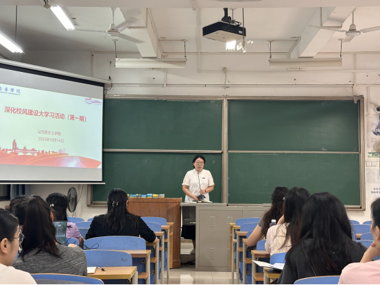 为统一思想认识,强化责任担当,深入推进校风建设,培育优良院风,扎实落实立德树人根本任务,推动学院实现内涵式高质量发展,10月14日下午,马克思主义学院在敷文园E105组织开展深化校风建设大学习活动。活动由学院副院长张雪娇主持,全体教师参加。