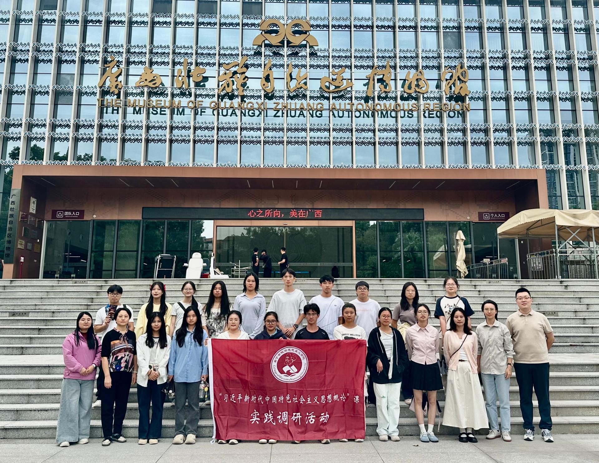 2025年10月25日,习近平新时代中国特色社会主义思想概论教研室师生团队赴广西壮族自治区博物馆,以“烽火南疆——广西近现代革命史陈列展”为实景教材开展实践教学。此次活动将红色文化资源与课程深度融合,推动思政课教育从理论学习走向实践体悟。