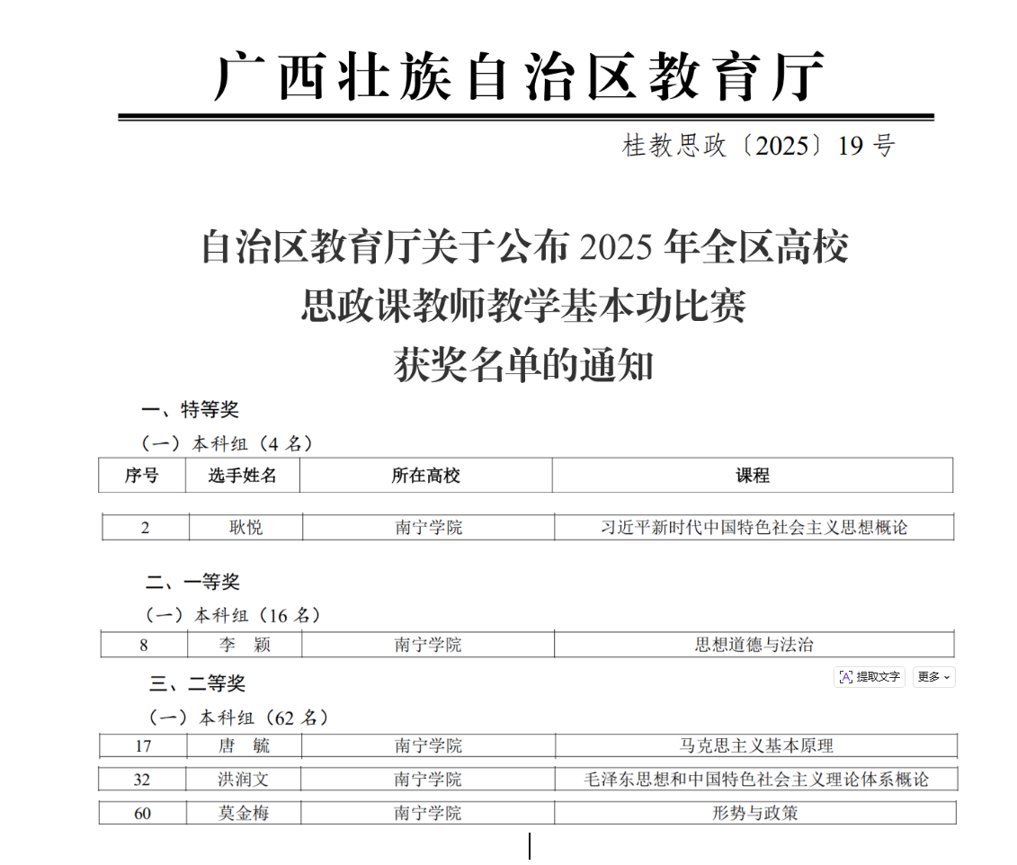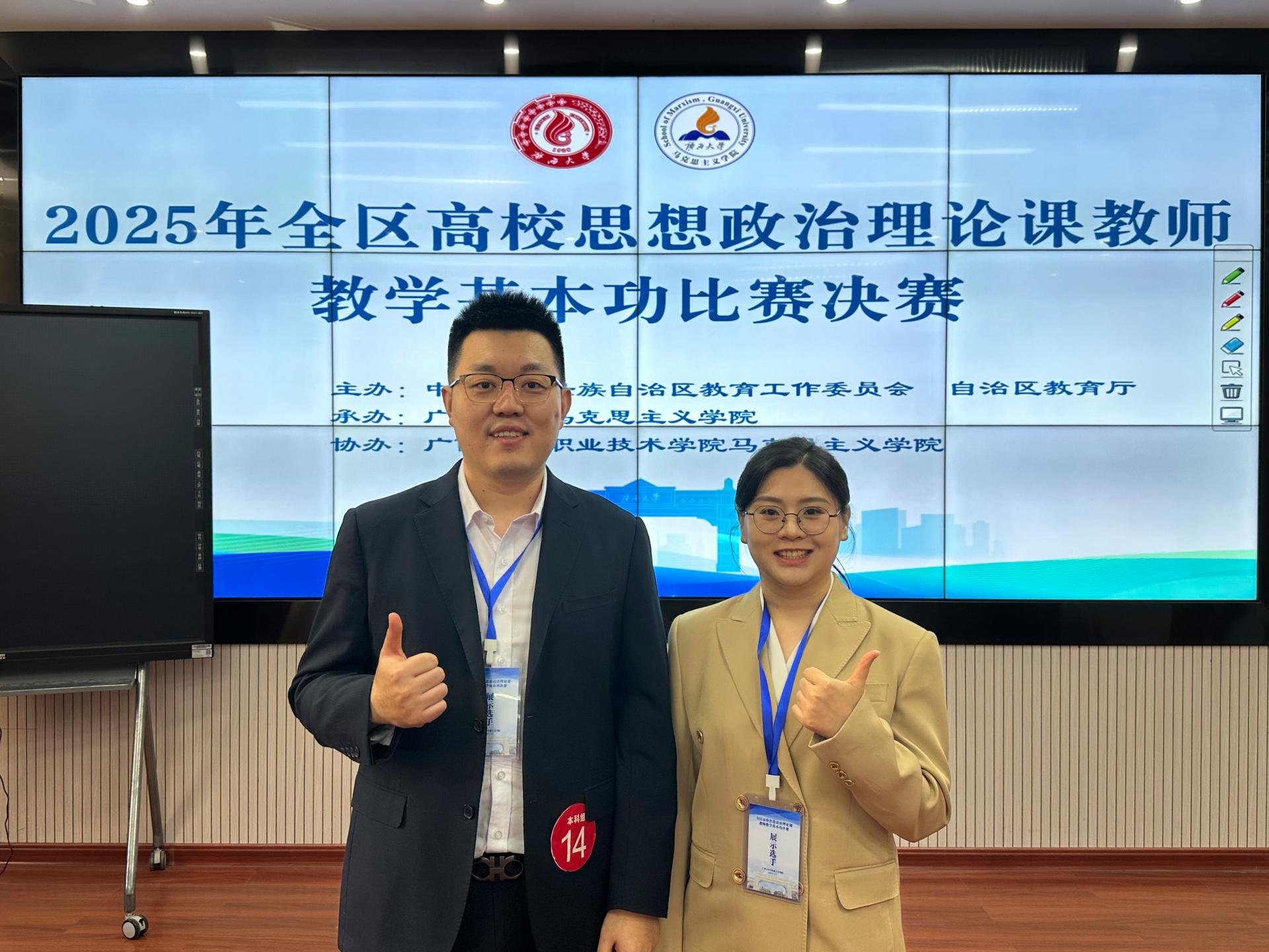 近日,自治区教育厅公布2025年广西高校思想政治理论课教师教学基本功比赛暨“精彩一课”评选活动获奖名单,马克思主义学院耿悦老师荣获本科组“特等奖”,李颖老师荣获本科组“一等奖”,莫金梅、唐毓、洪润文老师荣获本科组“二等奖”,取得了获奖率100%的好成绩。