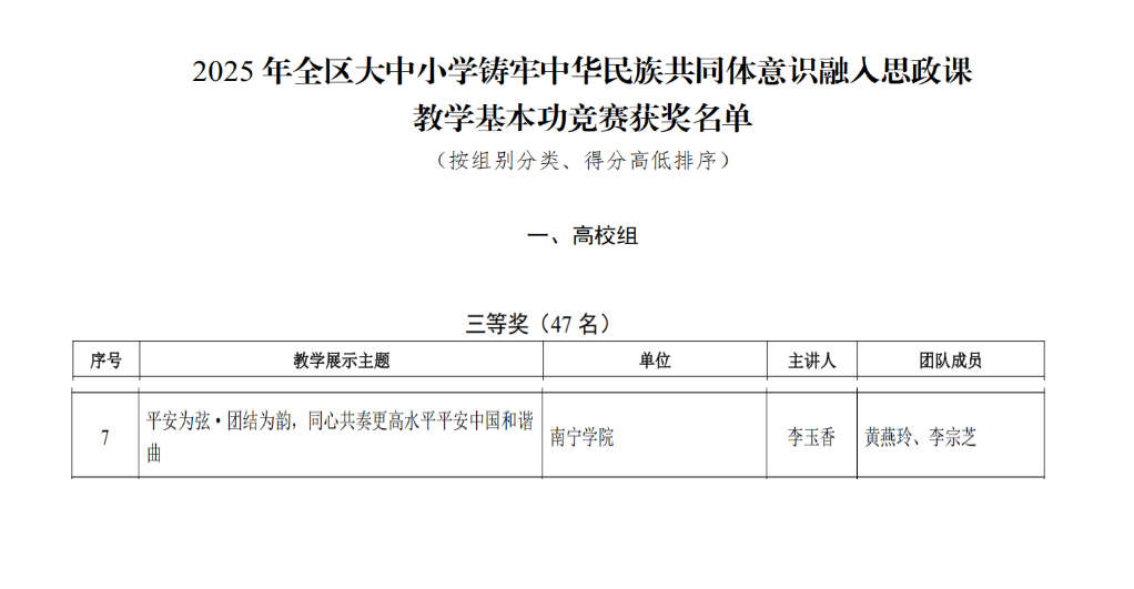 近日,自治区教育厅公布了2025年全区大中小学铸牢中华民族共同体意识融入思政课教学基本功竞赛获奖名单。我院李玉香、黄燕玲、李宗芝教师团队在比赛中表现突出,荣获高校组三等奖。这不仅是学院深化思政课教学改革创新的重要成果,更是扎实推进铸牢中华民族共同体意识教育的体现。
