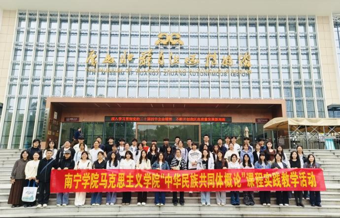 为深化我校学生对中华民族多元一体格局的系统认知,铸牢中华民族共同体意识,强化“五个共同”的正确中华民族历史观与“四个与共”的共同体理念,推动理论教学与实地研学深度融合,3月22日上午,马克思主义学院“中华民族共同体概论”课程教师团队组织课程学生代表,前往广西壮族自治区博物馆,在“吉金万里——中国西南地区青铜文明特展”中开展沉浸式实践教学。周月红、黄燕玲、刘姗姗等十余位教师及学生代表共67人参加本次活动。