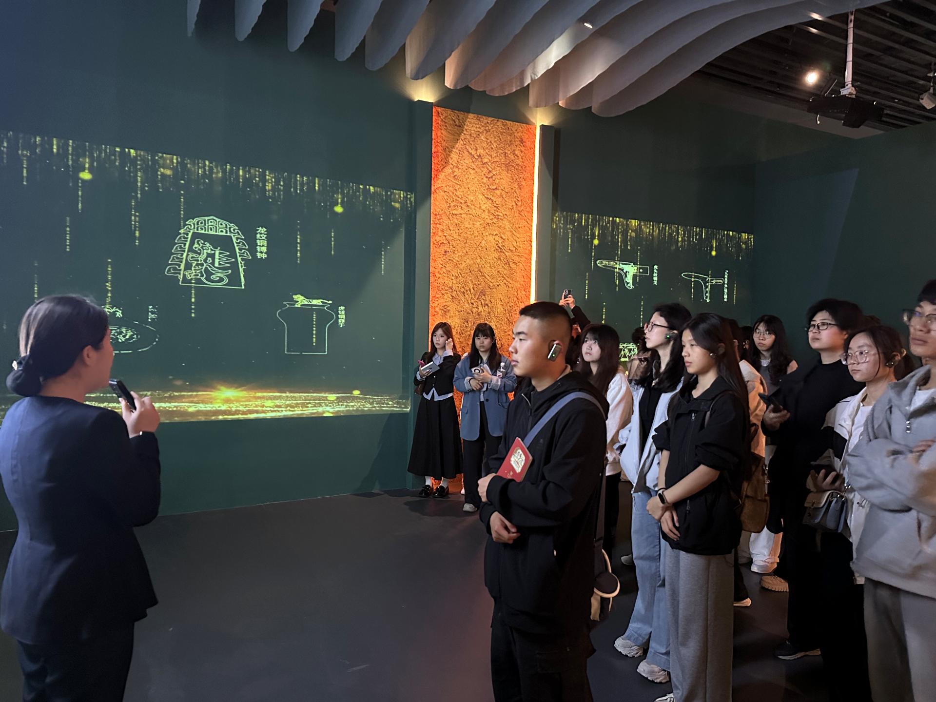 在展厅内,师生认真聆听讲解,不时驻足观察文物、交流探讨,教师团队同步开展现场教学。展厅围绕我国西南地区青铜文明发展脉络展开,从文化共性与地域特色的视角,展示四川、重庆、云南、广西、贵州等地青铜文明的独特风貌与交融印记,阐释青铜器所承载的各民族交往交流交融历史,探寻中华文明多元一体的文明密码。讲解内容由浅入深、层层递进,借助珍贵文物与翔实史料,引导学生跨越时空触摸历史文脉,真切感受青铜文明的深厚底蕴与独特魅力。师生们还通过沉浸式VR体验,在灯光、投影等声光电辅助展项与场景复原的加持下,“走进”古蜀国历史场景,多感官体验让展览内容更生动易懂。随后,学生们以小组为单位,围绕“铸牢中华民族共同体意识”主题拍摄创意视频,通过自行参观与实践,记录所观所想,增强了活动的参与感和获得感。
